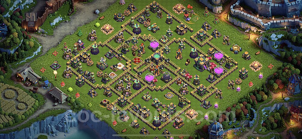 This Town Hall 14 hybrid base offers the best of both worlds - strong resource protection combined with effective trophy defense. The versatile design makes it an excellent choice for players who want to protect their loot while maintaining their trophy count. This balanced approach ensures you don't sacrifice one aspect of defense for another, making it ideal for active players across all league levels. The hybrid layout features centralized resource storages alongside a well-protected Town Hall, with multiple defensive layers that deter both farming raids and trophy pushers. High-value targets are strategically positioned within overlapping defense ranges, forcing attackers to make difficult choices about which objectives to prioritize. The compartmentalized design prevents attackers from easily achieving both loot destruction and the Town Hall kill in a single attack. Defense placement in this hybrid base creates strong coverage against both ground and air attacks. Inferno Towers, X-Bows, and Eagle Artillery work in concert to eliminate threats quickly, while splash damage defenses like Wizard Towers and Bomb Towers counter swarm strategies. The base's funnel-resistant design and strategic trap placement make it effective against popular attack strategies including QC LaLoon (Queen Charge Lava Hound Balloon), Blizzard attacks, and Yeti Smash compositions.