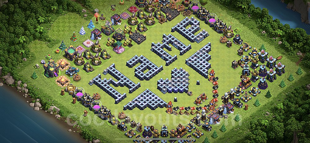 This Town Hall 14 war base is specifically designed to defend against 2-star and 3-star attacks in Clan Wars and Clan War Leagues. The strategic placement of defenses creates multiple compartments that force attackers to use more troops and spells than anticipated. Key defensive structures like Eagle Artillery, Inferno Towers, and X-Bows are positioned to cover crucial sections of the base, making it extremely difficult for opponents to secure a perfect attack. The core of this war base features a centralized Town Hall and Clan Castle, protected by multiple layers of walls and high-damage defenses. This layout forces attackers to commit significant resources just to reach the center, often leaving them without enough firepower to secure the Town Hall destruction. The anti-2-star design ensures that even if attackers breach the outer defenses, they'll struggle to achieve a 50% destruction rating. Air defenses are strategically spread to counter popular air attack strategies like LaLoon (Lava Hound + Balloons) and Electrone (Electro Dragons + Stone Slammer). The symmetrical trap placement and strategic Hidden Tesla positions create deadly surprise elements that can completely derail an attacker's plan. This base has been tested against various meta attack strategies and has consistently proven effective in preventing 3-star attacks.