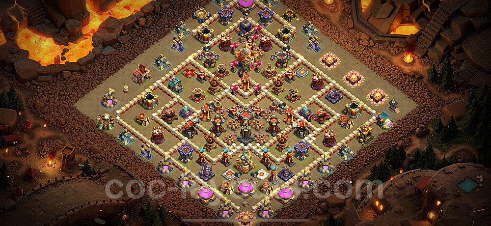 This Town Hall 16 war base is specifically designed to defend against 2-star and 3-star attacks in Clan Wars and Clan War Leagues. The strategic placement of defenses creates multiple compartments that force attackers to use more troops and spells than anticipated. Key defensive structures like Eagle Artillery, Inferno Towers, and X-Bows are positioned to cover crucial sections of the base, making it extremely difficult for opponents to secure a perfect attack. The core of this war base features a centralized Town Hall and Clan Castle, protected by multiple layers of walls and high-damage defenses. This layout forces attackers to commit significant resources just to reach the center, often leaving them without enough firepower to secure the Town Hall destruction. The anti-2-star design ensures that even if attackers breach the outer defenses, they'll struggle to achieve a 50% destruction rating. Air defenses are strategically spread to counter popular air attack strategies like LaLoon (Lava Hound + Balloons) and Electrone (Electro Dragons + Stone Slammer). The symmetrical trap placement and strategic Hidden Tesla positions create deadly surprise elements that can completely derail an attacker's plan. This base has been tested against various meta attack strategies and has consistently proven effective in preventing 3-star attacks.