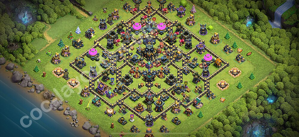 This Town Hall 17 hybrid base offers the best of both worlds - strong resource protection combined with effective trophy defense. The versatile design makes it an excellent choice for players who want to protect their loot while maintaining their trophy count. This balanced approach ensures you don't sacrifice one aspect of defense for another, making it ideal for active players across all league levels. The hybrid layout features centralized resource storages alongside a well-protected Town Hall, with multiple defensive layers that deter both farming raids and trophy pushers. High-value targets are strategically positioned within overlapping defense ranges, forcing attackers to make difficult choices about which objectives to prioritize. The compartmentalized design prevents attackers from easily achieving both loot destruction and the Town Hall kill in a single attack. Defense placement in this hybrid base creates strong coverage against both ground and air attacks. Inferno Towers, X-Bows, and Eagle Artillery work in concert to eliminate threats quickly, while splash damage defenses like Wizard Towers and Bomb Towers counter swarm strategies. The base's funnel-resistant design and strategic trap placement make it effective against popular attack strategies including QC LaLoon (Queen Charge Lava Hound Balloon), Blizzard attacks, and Yeti Smash compositions.