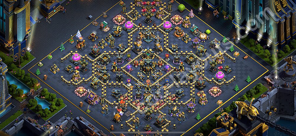 This Town Hall 17 war base is specifically designed to defend against 2-star and 3-star attacks in Clan Wars and Clan War Leagues. The strategic placement of defenses creates multiple compartments that force attackers to use more troops and spells than anticipated. Key defensive structures like Eagle Artillery, Inferno Towers, and X-Bows are positioned to cover crucial sections of the base, making it extremely difficult for opponents to secure a perfect attack. The core of this war base features a centralized Town Hall and Clan Castle, protected by multiple layers of walls and high-damage defenses. This layout forces attackers to commit significant resources just to reach the center, often leaving them without enough firepower to secure the Town Hall destruction. The anti-2-star design ensures that even if attackers breach the outer defenses, they'll struggle to achieve a 50% destruction rating. Air defenses are strategically spread to counter popular air attack strategies like LaLoon (Lava Hound + Balloons) and Electrone (Electro Dragons + Stone Slammer). The symmetrical trap placement and strategic Hidden Tesla positions create deadly surprise elements that can completely derail an attacker's plan. This base has been tested against various meta attack strategies and has consistently proven effective in preventing 3-star attacks.