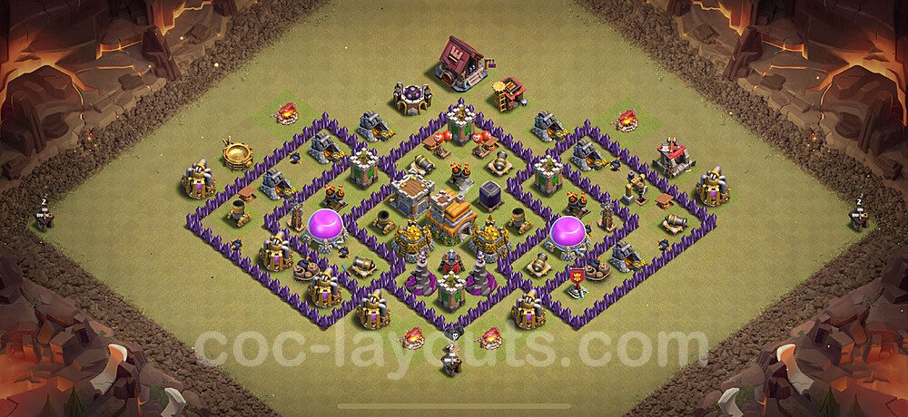 This Town Hall 7 hybrid base offers the best of both worlds - strong resource protection combined with effective trophy defense. The versatile design makes it an excellent choice for players who want to protect their loot while maintaining their trophy count. This balanced approach ensures you don't sacrifice one aspect of defense for another, making it ideal for active players across all league levels. The hybrid layout features centralized resource storages alongside a well-protected Town Hall, with multiple defensive layers that deter both farming raids and trophy pushers. High-value targets are strategically positioned within overlapping defense ranges, forcing attackers to make difficult choices about which objectives to prioritize. The compartmentalized design prevents attackers from easily achieving both loot destruction and the Town Hall kill in a single attack. Defense placement in this hybrid base creates strong coverage against both ground and air attacks. Inferno Towers, X-Bows, and Eagle Artillery work in concert to eliminate threats quickly, while splash damage defenses like Wizard Towers and Bomb Towers counter swarm strategies. The base's funnel-resistant design and strategic trap placement make it effective against popular attack strategies including QC LaLoon (Queen Charge Lava Hound Balloon), Blizzard attacks, and Yeti Smash compositions.