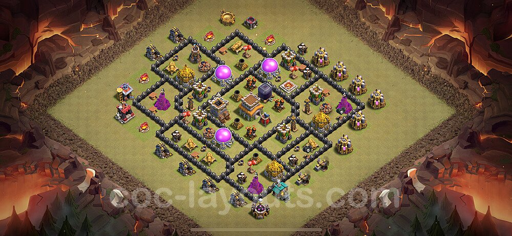 This Town Hall 8 war base is specifically designed to defend against 2-star and 3-star attacks in Clan Wars and Clan War Leagues. The strategic placement of defenses creates multiple compartments that force attackers to use more troops and spells than anticipated. Key defensive structures like Eagle Artillery, Inferno Towers, and X-Bows are positioned to cover crucial sections of the base, making it extremely difficult for opponents to secure a perfect attack. The core of this war base features a centralized Town Hall and Clan Castle, protected by multiple layers of walls and high-damage defenses. This layout forces attackers to commit significant resources just to reach the center, often leaving them without enough firepower to secure the Town Hall destruction. The anti-2-star design ensures that even if attackers breach the outer defenses, they'll struggle to achieve a 50% destruction rating. Air defenses are strategically spread to counter popular air attack strategies like LaLoon (Lava Hound + Balloons) and Electrone (Electro Dragons + Stone Slammer). The symmetrical trap placement and strategic Hidden Tesla positions create deadly surprise elements that can completely derail an attacker's plan. This base has been tested against various meta attack strategies and has consistently proven effective in preventing 3-star attacks.