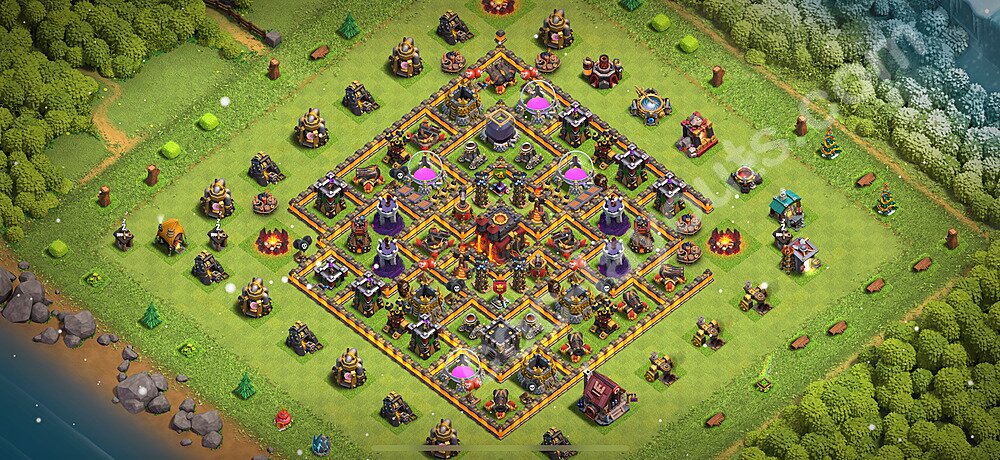 This Town Hall 10 farming base is optimized to protect your resources including Gold, Elixir, and Dark Elixir from raiders. The layout features centralized storages with multiple compartments that make it extremely difficult for attackers to steal large amounts of resources in a single raid. This design philosophy prioritizes resource protection over trophies, making it ideal for players focused on upgrading their village. The strategic placement of resource storages ensures they are well-protected by high-damage defenses like X-Bows, Inferno Towers, and Eagle Artillery. Each storage is surrounded by multiple wall layers and defensive structures, forcing attackers to invest heavily in troops and spells to reach your loot. The farming base design also incorporates strategic dead zones where attackers' troops tend to path inefficiently, wasting time and taking heavy damage from nearby defenses. Collectors and mines are positioned on the outer edges as "bait" while your main storages remain heavily protected in the core. This layout has proven effective against common farming strategies like BARCH (Barbarians + Archers), GoWiPe (Golems + Wizards + Pekka), and mass Miner attacks. The compartmentalized design prevents attackers from funneling straight to your resources, ensuring you maintain your hard-earned loot for important upgrades.