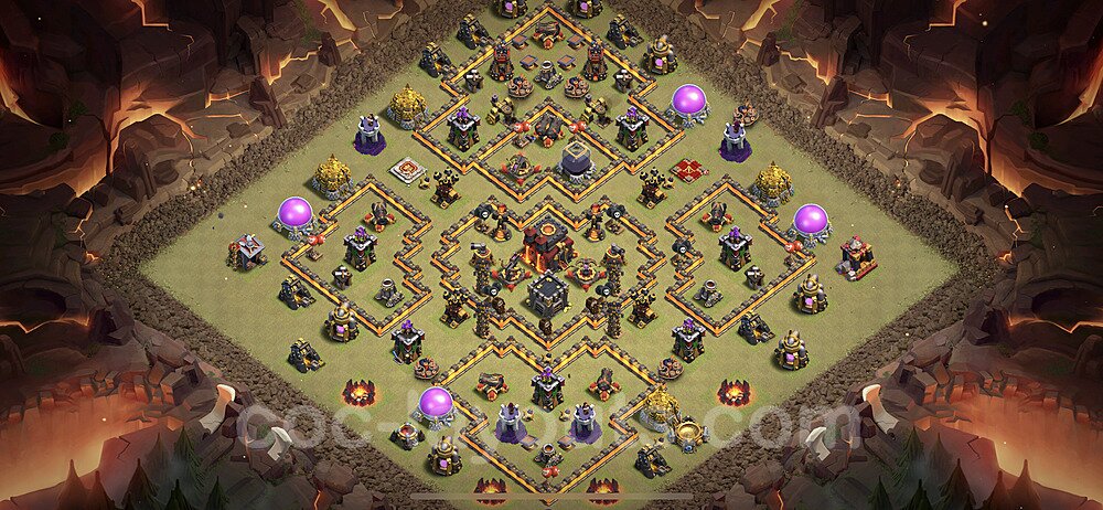 This Town Hall 10 war base is specifically designed to defend against 2-star and 3-star attacks in Clan Wars and Clan War Leagues. The strategic placement of defenses creates multiple compartments that force attackers to use more troops and spells than anticipated. Key defensive structures like Eagle Artillery, Inferno Towers, and X-Bows are positioned to cover crucial sections of the base, making it extremely difficult for opponents to secure a perfect attack. The core of this war base features a centralized Town Hall and Clan Castle, protected by multiple layers of walls and high-damage defenses. This layout forces attackers to commit significant resources just to reach the center, often leaving them without enough firepower to secure the Town Hall destruction. The anti-2-star design ensures that even if attackers breach the outer defenses, they'll struggle to achieve a 50% destruction rating. Air defenses are strategically spread to counter popular air attack strategies like LaLoon (Lava Hound + Balloons) and Electrone (Electro Dragons + Stone Slammer). The symmetrical trap placement and strategic Hidden Tesla positions create deadly surprise elements that can completely derail an attacker's plan. This base has been tested against various meta attack strategies and has consistently proven effective in preventing 3-star attacks.