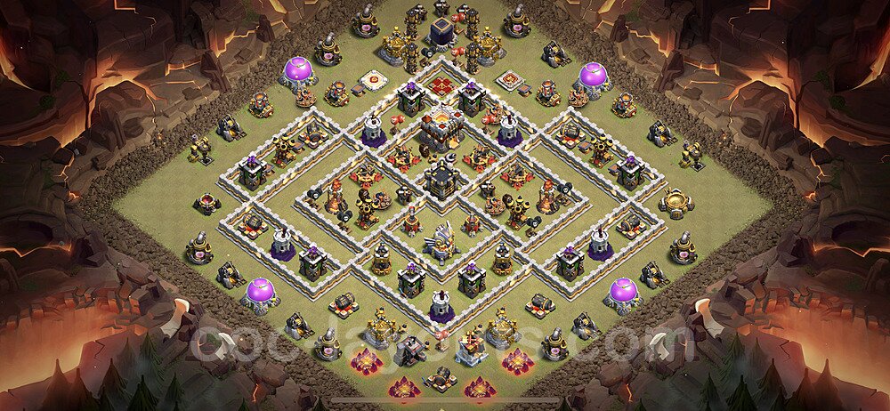 This Town Hall 11 war base is specifically designed to defend against 2-star and 3-star attacks in Clan Wars and Clan War Leagues. The strategic placement of defenses creates multiple compartments that force attackers to use more troops and spells than anticipated. Key defensive structures like Eagle Artillery, Inferno Towers, and X-Bows are positioned to cover crucial sections of the base, making it extremely difficult for opponents to secure a perfect attack. The core of this war base features a centralized Town Hall and Clan Castle, protected by multiple layers of walls and high-damage defenses. This layout forces attackers to commit significant resources just to reach the center, often leaving them without enough firepower to secure the Town Hall destruction. The anti-2-star design ensures that even if attackers breach the outer defenses, they'll struggle to achieve a 50% destruction rating. Air defenses are strategically spread to counter popular air attack strategies like LaLoon (Lava Hound + Balloons) and Electrone (Electro Dragons + Stone Slammer). The symmetrical trap placement and strategic Hidden Tesla positions create deadly surprise elements that can completely derail an attacker's plan. This base has been tested against various meta attack strategies and has consistently proven effective in preventing 3-star attacks.