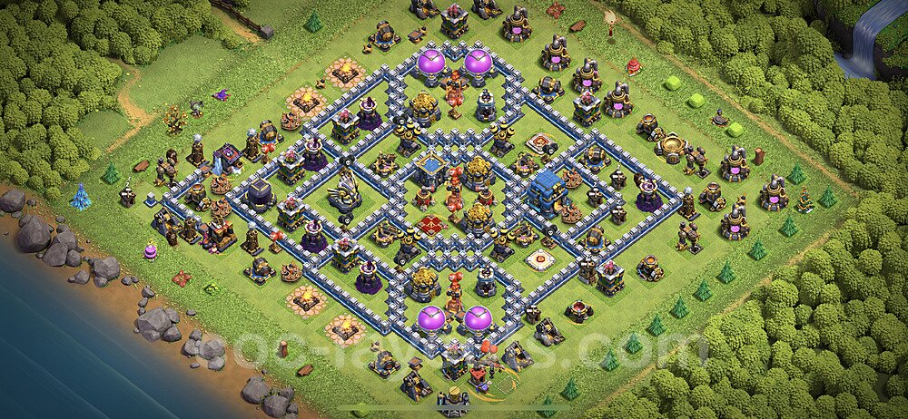 This Town Hall 12 farming base is optimized to protect your resources including Gold, Elixir, and Dark Elixir from raiders. The layout features centralized storages with multiple compartments that make it extremely difficult for attackers to steal large amounts of resources in a single raid. This design philosophy prioritizes resource protection over trophies, making it ideal for players focused on upgrading their village. The strategic placement of resource storages ensures they are well-protected by high-damage defenses like X-Bows, Inferno Towers, and Eagle Artillery. Each storage is surrounded by multiple wall layers and defensive structures, forcing attackers to invest heavily in troops and spells to reach your loot. The farming base design also incorporates strategic dead zones where attackers' troops tend to path inefficiently, wasting time and taking heavy damage from nearby defenses. Collectors and mines are positioned on the outer edges as "bait" while your main storages remain heavily protected in the core. This layout has proven effective against common farming strategies like BARCH (Barbarians + Archers), GoWiPe (Golems + Wizards + Pekka), and mass Miner attacks. The compartmentalized design prevents attackers from funneling straight to your resources, ensuring you maintain your hard-earned loot for important upgrades.