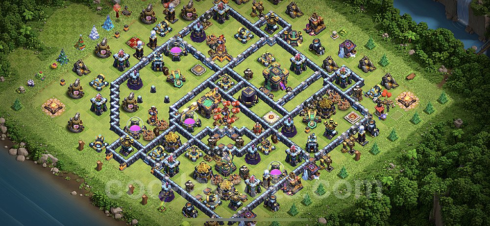 This Town Hall 14 hybrid base offers the best of both worlds - strong resource protection combined with effective trophy defense. The versatile design makes it an excellent choice for players who want to protect their loot while maintaining their trophy count. This balanced approach ensures you don't sacrifice one aspect of defense for another, making it ideal for active players across all league levels. The hybrid layout features centralized resource storages alongside a well-protected Town Hall, with multiple defensive layers that deter both farming raids and trophy pushers. High-value targets are strategically positioned within overlapping defense ranges, forcing attackers to make difficult choices about which objectives to prioritize. The compartmentalized design prevents attackers from easily achieving both loot destruction and the Town Hall kill in a single attack. Defense placement in this hybrid base creates strong coverage against both ground and air attacks. Inferno Towers, X-Bows, and Eagle Artillery work in concert to eliminate threats quickly, while splash damage defenses like Wizard Towers and Bomb Towers counter swarm strategies. The base's funnel-resistant design and strategic trap placement make it effective against popular attack strategies including QC LaLoon (Queen Charge Lava Hound Balloon), Blizzard attacks, and Yeti Smash compositions.