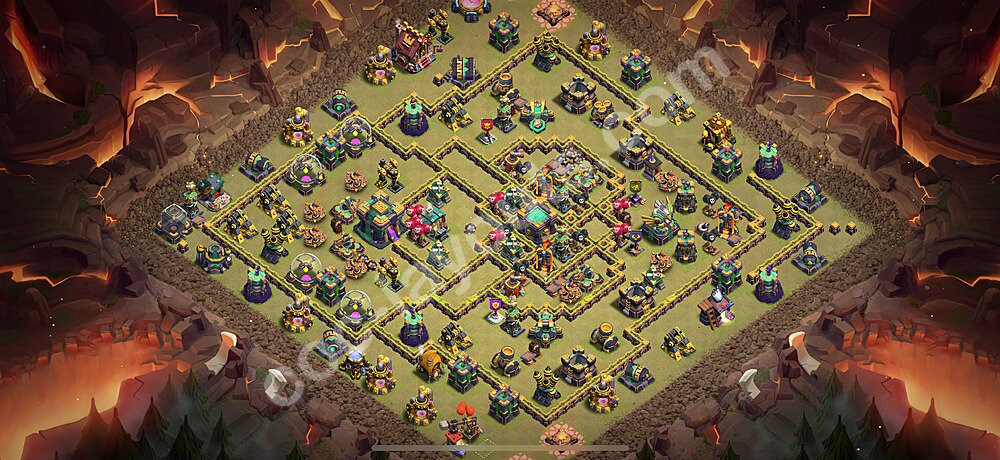 This Town Hall 14 war base is specifically designed to defend against 2-star and 3-star attacks in Clan Wars and Clan War Leagues. The strategic placement of defenses creates multiple compartments that force attackers to use more troops and spells than anticipated. Key defensive structures like Eagle Artillery, Inferno Towers, and X-Bows are positioned to cover crucial sections of the base, making it extremely difficult for opponents to secure a perfect attack. The core of this war base features a centralized Town Hall and Clan Castle, protected by multiple layers of walls and high-damage defenses. This layout forces attackers to commit significant resources just to reach the center, often leaving them without enough firepower to secure the Town Hall destruction. The anti-2-star design ensures that even if attackers breach the outer defenses, they'll struggle to achieve a 50% destruction rating. Air defenses are strategically spread to counter popular air attack strategies like LaLoon (Lava Hound + Balloons) and Electrone (Electro Dragons + Stone Slammer). The symmetrical trap placement and strategic Hidden Tesla positions create deadly surprise elements that can completely derail an attacker's plan. This base has been tested against various meta attack strategies and has consistently proven effective in preventing 3-star attacks.