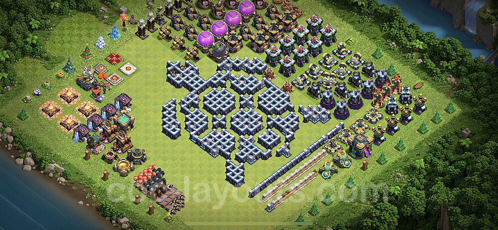 This Town Hall 14 war base is specifically designed to defend against 2-star and 3-star attacks in Clan Wars and Clan War Leagues. The strategic placement of defenses creates multiple compartments that force attackers to use more troops and spells than anticipated. Key defensive structures like Eagle Artillery, Inferno Towers, and X-Bows are positioned to cover crucial sections of the base, making it extremely difficult for opponents to secure a perfect attack. The core of this war base features a centralized Town Hall and Clan Castle, protected by multiple layers of walls and high-damage defenses. This layout forces attackers to commit significant resources just to reach the center, often leaving them without enough firepower to secure the Town Hall destruction. The anti-2-star design ensures that even if attackers breach the outer defenses, they'll struggle to achieve a 50% destruction rating. Air defenses are strategically spread to counter popular air attack strategies like LaLoon (Lava Hound + Balloons) and Electrone (Electro Dragons + Stone Slammer). The symmetrical trap placement and strategic Hidden Tesla positions create deadly surprise elements that can completely derail an attacker's plan. This base has been tested against various meta attack strategies and has consistently proven effective in preventing 3-star attacks.