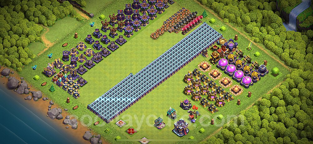 This Town Hall 15 war base is specifically designed to defend against 2-star and 3-star attacks in Clan Wars and Clan War Leagues. The strategic placement of defenses creates multiple compartments that force attackers to use more troops and spells than anticipated. Key defensive structures like Eagle Artillery, Inferno Towers, and X-Bows are positioned to cover crucial sections of the base, making it extremely difficult for opponents to secure a perfect attack. The core of this war base features a centralized Town Hall and Clan Castle, protected by multiple layers of walls and high-damage defenses. This layout forces attackers to commit significant resources just to reach the center, often leaving them without enough firepower to secure the Town Hall destruction. The anti-2-star design ensures that even if attackers breach the outer defenses, they'll struggle to achieve a 50% destruction rating. Air defenses are strategically spread to counter popular air attack strategies like LaLoon (Lava Hound + Balloons) and Electrone (Electro Dragons + Stone Slammer). The symmetrical trap placement and strategic Hidden Tesla positions create deadly surprise elements that can completely derail an attacker's plan. This base has been tested against various meta attack strategies and has consistently proven effective in preventing 3-star attacks.