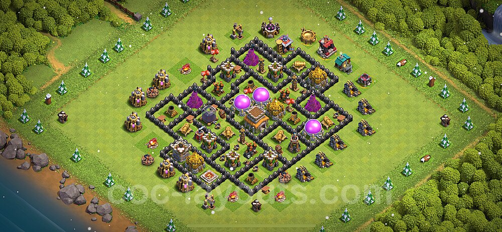 This Town Hall 8 trophy pushing base is engineered for maximum defensive capability to help you climb and maintain higher trophy leagues. The design focuses on preventing attackers from achieving the 50% destruction threshold needed to steal trophies, with a heavily fortified Town Hall position and anti-2-star compartmentalization. This layout is perfect for competitive players aiming to reach Champion, Titan, or Legend League. The strategic placement of defenses creates overlapping coverage that makes it nearly impossible for attackers to access the core without facing devastating firepower. High-DPS defenses like Inferno Towers and Eagle Artillery are positioned to protect the Town Hall from all angles, while splash damage defenses counter mass troop strategies. The anti-air coverage is exceptionally strong, with Air Defenses, Air Sweepers, and Wizard Towers positioned to eliminate aerial threats quickly. Trap placement in this trophy base is optimized to counter popular attack strategies seen in higher leagues. Spring Traps are positioned to eliminate Hog Riders and Valkyries, while Giant Bombs target Balloons and Wall Breakers. The base's asymmetrical design confuses attackers' pathing algorithms, causing troops to split and take unnecessary damage. This layout has been battle-tested in Legend League and has consistently helped players maintain their trophies against skilled attackers.