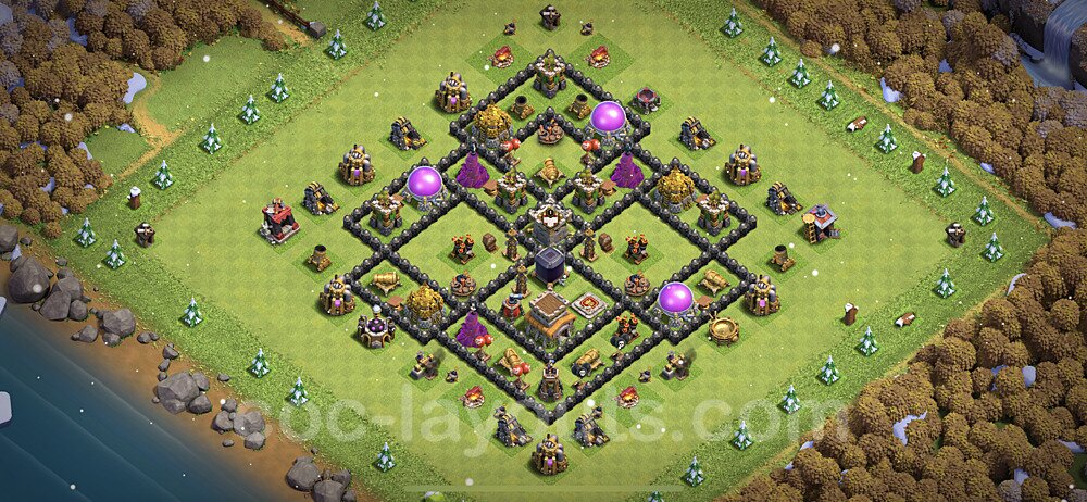 This Town Hall 8 war base is specifically designed to defend against 2-star and 3-star attacks in Clan Wars and Clan War Leagues. The strategic placement of defenses creates multiple compartments that force attackers to use more troops and spells than anticipated. Key defensive structures like Eagle Artillery, Inferno Towers, and X-Bows are positioned to cover crucial sections of the base, making it extremely difficult for opponents to secure a perfect attack. The core of this war base features a centralized Town Hall and Clan Castle, protected by multiple layers of walls and high-damage defenses. This layout forces attackers to commit significant resources just to reach the center, often leaving them without enough firepower to secure the Town Hall destruction. The anti-2-star design ensures that even if attackers breach the outer defenses, they'll struggle to achieve a 50% destruction rating. Air defenses are strategically spread to counter popular air attack strategies like LaLoon (Lava Hound + Balloons) and Electrone (Electro Dragons + Stone Slammer). The symmetrical trap placement and strategic Hidden Tesla positions create deadly surprise elements that can completely derail an attacker's plan. This base has been tested against various meta attack strategies and has consistently proven effective in preventing 3-star attacks.