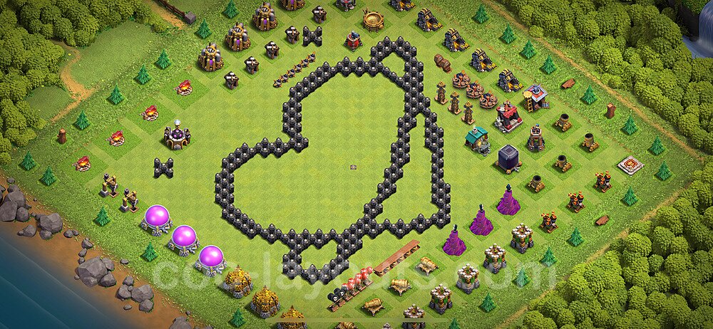 This Town Hall 8 war base is specifically designed to defend against 2-star and 3-star attacks in Clan Wars and Clan War Leagues. The strategic placement of defenses creates multiple compartments that force attackers to use more troops and spells than anticipated. Key defensive structures like Eagle Artillery, Inferno Towers, and X-Bows are positioned to cover crucial sections of the base, making it extremely difficult for opponents to secure a perfect attack. The core of this war base features a centralized Town Hall and Clan Castle, protected by multiple layers of walls and high-damage defenses. This layout forces attackers to commit significant resources just to reach the center, often leaving them without enough firepower to secure the Town Hall destruction. The anti-2-star design ensures that even if attackers breach the outer defenses, they'll struggle to achieve a 50% destruction rating. Air defenses are strategically spread to counter popular air attack strategies like LaLoon (Lava Hound + Balloons) and Electrone (Electro Dragons + Stone Slammer). The symmetrical trap placement and strategic Hidden Tesla positions create deadly surprise elements that can completely derail an attacker's plan. This base has been tested against various meta attack strategies and has consistently proven effective in preventing 3-star attacks.