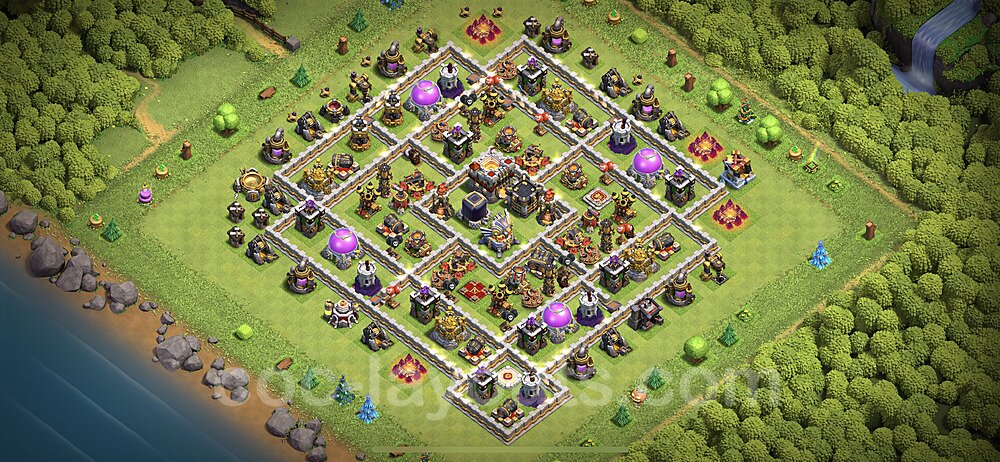 This Town Hall 11 farming base is optimized to protect your resources including Gold, Elixir, and Dark Elixir from raiders. The layout features centralized storages with multiple compartments that make it extremely difficult for attackers to steal large amounts of resources in a single raid. This design philosophy prioritizes resource protection over trophies, making it ideal for players focused on upgrading their village. The strategic placement of resource storages ensures they are well-protected by high-damage defenses like X-Bows, Inferno Towers, and Eagle Artillery. Each storage is surrounded by multiple wall layers and defensive structures, forcing attackers to invest heavily in troops and spells to reach your loot. The farming base design also incorporates strategic dead zones where attackers' troops tend to path inefficiently, wasting time and taking heavy damage from nearby defenses. Collectors and mines are positioned on the outer edges as "bait" while your main storages remain heavily protected in the core. This layout has proven effective against common farming strategies like BARCH (Barbarians + Archers), GoWiPe (Golems + Wizards + Pekka), and mass Miner attacks. The compartmentalized design prevents attackers from funneling straight to your resources, ensuring you maintain your hard-earned loot for important upgrades.