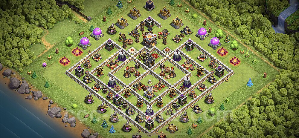 This Town Hall 11 trophy pushing base is engineered for maximum defensive capability to help you climb and maintain higher trophy leagues. The design focuses on preventing attackers from achieving the 50% destruction threshold needed to steal trophies, with a heavily fortified Town Hall position and anti-2-star compartmentalization. This layout is perfect for competitive players aiming to reach Champion, Titan, or Legend League. The strategic placement of defenses creates overlapping coverage that makes it nearly impossible for attackers to access the core without facing devastating firepower. High-DPS defenses like Inferno Towers and Eagle Artillery are positioned to protect the Town Hall from all angles, while splash damage defenses counter mass troop strategies. The anti-air coverage is exceptionally strong, with Air Defenses, Air Sweepers, and Wizard Towers positioned to eliminate aerial threats quickly. Trap placement in this trophy base is optimized to counter popular attack strategies seen in higher leagues. Spring Traps are positioned to eliminate Hog Riders and Valkyries, while Giant Bombs target Balloons and Wall Breakers. The base's asymmetrical design confuses attackers' pathing algorithms, causing troops to split and take unnecessary damage. This layout has been battle-tested in Legend League and has consistently helped players maintain their trophies against skilled attackers.