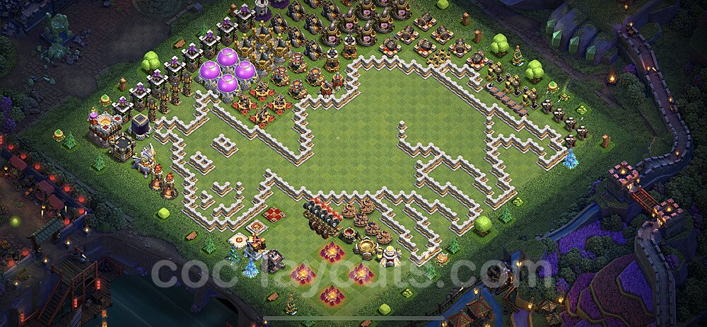 This Town Hall 11 war base is specifically designed to defend against 2-star and 3-star attacks in Clan Wars and Clan War Leagues. The strategic placement of defenses creates multiple compartments that force attackers to use more troops and spells than anticipated. Key defensive structures like Eagle Artillery, Inferno Towers, and X-Bows are positioned to cover crucial sections of the base, making it extremely difficult for opponents to secure a perfect attack. The core of this war base features a centralized Town Hall and Clan Castle, protected by multiple layers of walls and high-damage defenses. This layout forces attackers to commit significant resources just to reach the center, often leaving them without enough firepower to secure the Town Hall destruction. The anti-2-star design ensures that even if attackers breach the outer defenses, they'll struggle to achieve a 50% destruction rating. Air defenses are strategically spread to counter popular air attack strategies like LaLoon (Lava Hound + Balloons) and Electrone (Electro Dragons + Stone Slammer). The symmetrical trap placement and strategic Hidden Tesla positions create deadly surprise elements that can completely derail an attacker's plan. This base has been tested against various meta attack strategies and has consistently proven effective in preventing 3-star attacks.