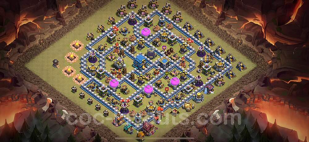 This Town Hall 12 hybrid base offers the best of both worlds - strong resource protection combined with effective trophy defense. The versatile design makes it an excellent choice for players who want to protect their loot while maintaining their trophy count. This balanced approach ensures you don't sacrifice one aspect of defense for another, making it ideal for active players across all league levels. The hybrid layout features centralized resource storages alongside a well-protected Town Hall, with multiple defensive layers that deter both farming raids and trophy pushers. High-value targets are strategically positioned within overlapping defense ranges, forcing attackers to make difficult choices about which objectives to prioritize. The compartmentalized design prevents attackers from easily achieving both loot destruction and the Town Hall kill in a single attack. Defense placement in this hybrid base creates strong coverage against both ground and air attacks. Inferno Towers, X-Bows, and Eagle Artillery work in concert to eliminate threats quickly, while splash damage defenses like Wizard Towers and Bomb Towers counter swarm strategies. The base's funnel-resistant design and strategic trap placement make it effective against popular attack strategies including QC LaLoon (Queen Charge Lava Hound Balloon), Blizzard attacks, and Yeti Smash compositions.
