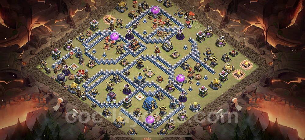 This Town Hall 12 war base is specifically designed to defend against 2-star and 3-star attacks in Clan Wars and Clan War Leagues. The strategic placement of defenses creates multiple compartments that force attackers to use more troops and spells than anticipated. Key defensive structures like Eagle Artillery, Inferno Towers, and X-Bows are positioned to cover crucial sections of the base, making it extremely difficult for opponents to secure a perfect attack. The core of this war base features a centralized Town Hall and Clan Castle, protected by multiple layers of walls and high-damage defenses. This layout forces attackers to commit significant resources just to reach the center, often leaving them without enough firepower to secure the Town Hall destruction. The anti-2-star design ensures that even if attackers breach the outer defenses, they'll struggle to achieve a 50% destruction rating. Air defenses are strategically spread to counter popular air attack strategies like LaLoon (Lava Hound + Balloons) and Electrone (Electro Dragons + Stone Slammer). The symmetrical trap placement and strategic Hidden Tesla positions create deadly surprise elements that can completely derail an attacker's plan. This base has been tested against various meta attack strategies and has consistently proven effective in preventing 3-star attacks.