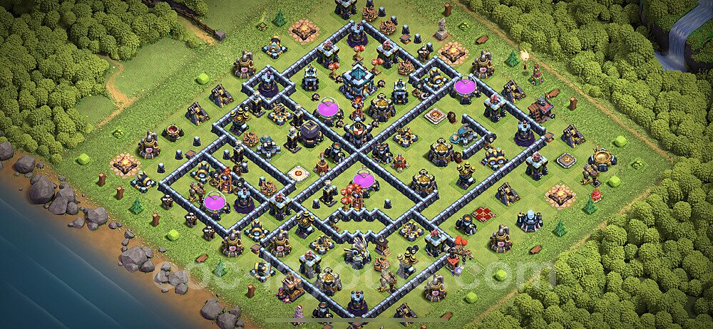 This Town Hall 13 hybrid base offers the best of both worlds - strong resource protection combined with effective trophy defense. The versatile design makes it an excellent choice for players who want to protect their loot while maintaining their trophy count. This balanced approach ensures you don't sacrifice one aspect of defense for another, making it ideal for active players across all league levels. The hybrid layout features centralized resource storages alongside a well-protected Town Hall, with multiple defensive layers that deter both farming raids and trophy pushers. High-value targets are strategically positioned within overlapping defense ranges, forcing attackers to make difficult choices about which objectives to prioritize. The compartmentalized design prevents attackers from easily achieving both loot destruction and the Town Hall kill in a single attack. Defense placement in this hybrid base creates strong coverage against both ground and air attacks. Inferno Towers, X-Bows, and Eagle Artillery work in concert to eliminate threats quickly, while splash damage defenses like Wizard Towers and Bomb Towers counter swarm strategies. The base's funnel-resistant design and strategic trap placement make it effective against popular attack strategies including QC LaLoon (Queen Charge Lava Hound Balloon), Blizzard attacks, and Yeti Smash compositions.