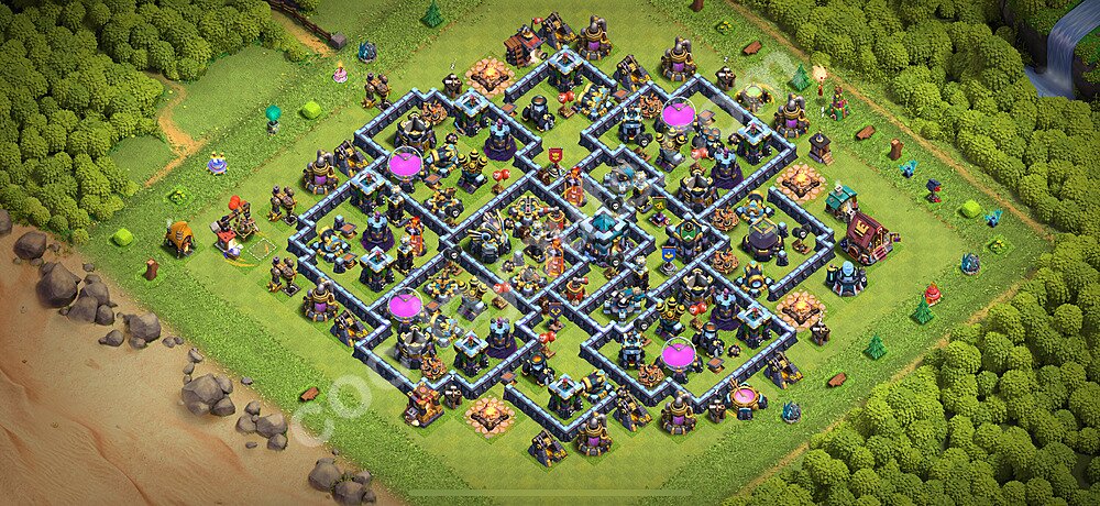 This Town Hall 13 war base is specifically designed to defend against 2-star and 3-star attacks in Clan Wars and Clan War Leagues. The strategic placement of defenses creates multiple compartments that force attackers to use more troops and spells than anticipated. Key defensive structures like Eagle Artillery, Inferno Towers, and X-Bows are positioned to cover crucial sections of the base, making it extremely difficult for opponents to secure a perfect attack. The core of this war base features a centralized Town Hall and Clan Castle, protected by multiple layers of walls and high-damage defenses. This layout forces attackers to commit significant resources just to reach the center, often leaving them without enough firepower to secure the Town Hall destruction. The anti-2-star design ensures that even if attackers breach the outer defenses, they'll struggle to achieve a 50% destruction rating. Air defenses are strategically spread to counter popular air attack strategies like LaLoon (Lava Hound + Balloons) and Electrone (Electro Dragons + Stone Slammer). The symmetrical trap placement and strategic Hidden Tesla positions create deadly surprise elements that can completely derail an attacker's plan. This base has been tested against various meta attack strategies and has consistently proven effective in preventing 3-star attacks.