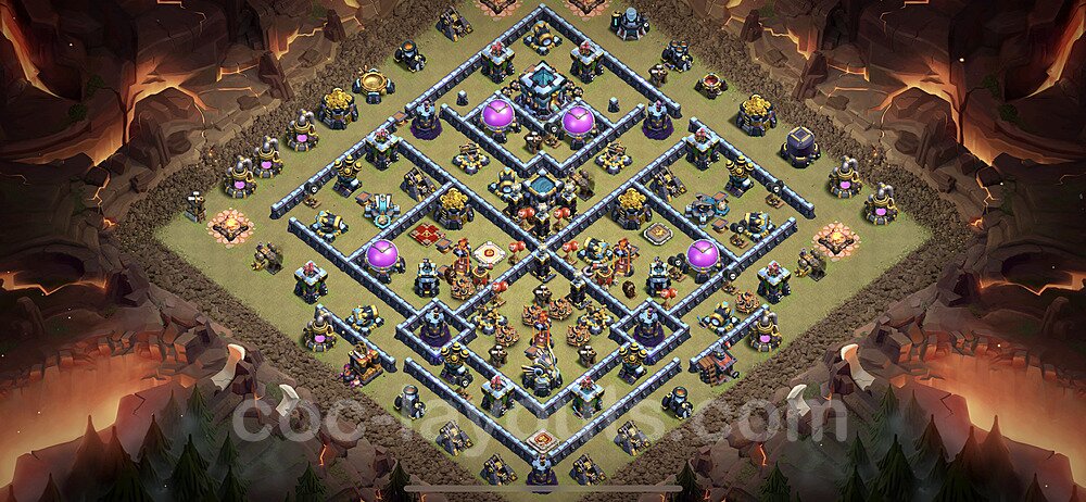 This Town Hall 13 war base is specifically designed to defend against 2-star and 3-star attacks in Clan Wars and Clan War Leagues. The strategic placement of defenses creates multiple compartments that force attackers to use more troops and spells than anticipated. Key defensive structures like Eagle Artillery, Inferno Towers, and X-Bows are positioned to cover crucial sections of the base, making it extremely difficult for opponents to secure a perfect attack. The core of this war base features a centralized Town Hall and Clan Castle, protected by multiple layers of walls and high-damage defenses. This layout forces attackers to commit significant resources just to reach the center, often leaving them without enough firepower to secure the Town Hall destruction. The anti-2-star design ensures that even if attackers breach the outer defenses, they'll struggle to achieve a 50% destruction rating. Air defenses are strategically spread to counter popular air attack strategies like LaLoon (Lava Hound + Balloons) and Electrone (Electro Dragons + Stone Slammer). The symmetrical trap placement and strategic Hidden Tesla positions create deadly surprise elements that can completely derail an attacker's plan. This base has been tested against various meta attack strategies and has consistently proven effective in preventing 3-star attacks.