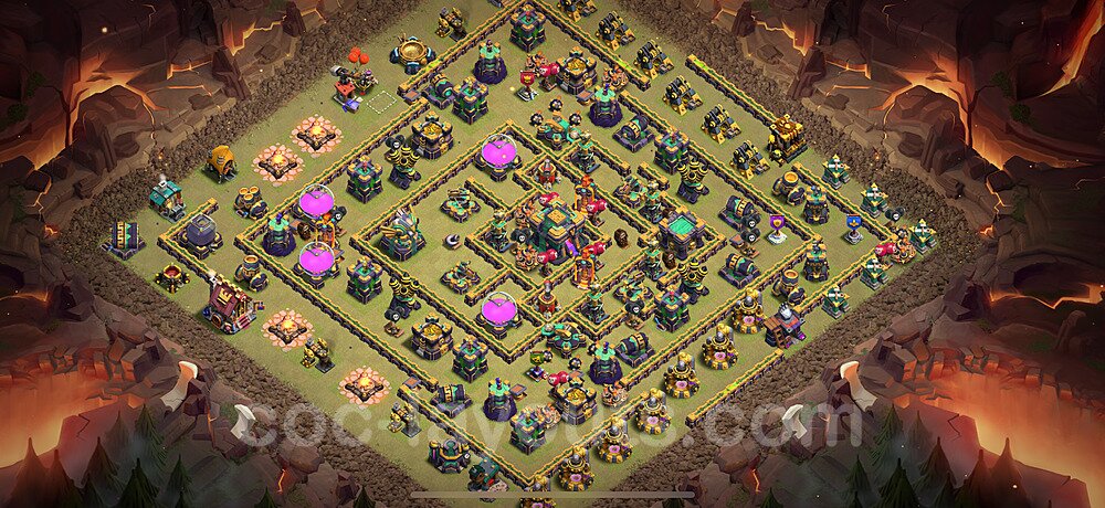 This Town Hall 14 war base is specifically designed to defend against 2-star and 3-star attacks in Clan Wars and Clan War Leagues. The strategic placement of defenses creates multiple compartments that force attackers to use more troops and spells than anticipated. Key defensive structures like Eagle Artillery, Inferno Towers, and X-Bows are positioned to cover crucial sections of the base, making it extremely difficult for opponents to secure a perfect attack. The core of this war base features a centralized Town Hall and Clan Castle, protected by multiple layers of walls and high-damage defenses. This layout forces attackers to commit significant resources just to reach the center, often leaving them without enough firepower to secure the Town Hall destruction. The anti-2-star design ensures that even if attackers breach the outer defenses, they'll struggle to achieve a 50% destruction rating. Air defenses are strategically spread to counter popular air attack strategies like LaLoon (Lava Hound + Balloons) and Electrone (Electro Dragons + Stone Slammer). The symmetrical trap placement and strategic Hidden Tesla positions create deadly surprise elements that can completely derail an attacker's plan. This base has been tested against various meta attack strategies and has consistently proven effective in preventing 3-star attacks.