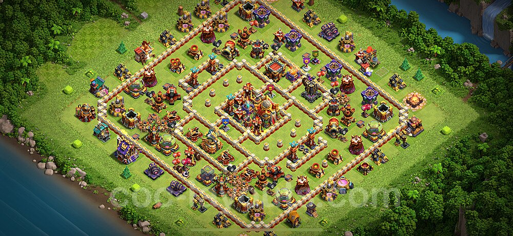 This Town Hall 16 hybrid base offers the best of both worlds - strong resource protection combined with effective trophy defense. The versatile design makes it an excellent choice for players who want to protect their loot while maintaining their trophy count. This balanced approach ensures you don't sacrifice one aspect of defense for another, making it ideal for active players across all league levels. The hybrid layout features centralized resource storages alongside a well-protected Town Hall, with multiple defensive layers that deter both farming raids and trophy pushers. High-value targets are strategically positioned within overlapping defense ranges, forcing attackers to make difficult choices about which objectives to prioritize. The compartmentalized design prevents attackers from easily achieving both loot destruction and the Town Hall kill in a single attack. Defense placement in this hybrid base creates strong coverage against both ground and air attacks. Inferno Towers, X-Bows, and Eagle Artillery work in concert to eliminate threats quickly, while splash damage defenses like Wizard Towers and Bomb Towers counter swarm strategies. The base's funnel-resistant design and strategic trap placement make it effective against popular attack strategies including QC LaLoon (Queen Charge Lava Hound Balloon), Blizzard attacks, and Yeti Smash compositions.