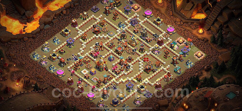 This Town Hall 16 war base is specifically designed to defend against 2-star and 3-star attacks in Clan Wars and Clan War Leagues. The strategic placement of defenses creates multiple compartments that force attackers to use more troops and spells than anticipated. Key defensive structures like Eagle Artillery, Inferno Towers, and X-Bows are positioned to cover crucial sections of the base, making it extremely difficult for opponents to secure a perfect attack. The core of this war base features a centralized Town Hall and Clan Castle, protected by multiple layers of walls and high-damage defenses. This layout forces attackers to commit significant resources just to reach the center, often leaving them without enough firepower to secure the Town Hall destruction. The anti-2-star design ensures that even if attackers breach the outer defenses, they'll struggle to achieve a 50% destruction rating. Air defenses are strategically spread to counter popular air attack strategies like LaLoon (Lava Hound + Balloons) and Electrone (Electro Dragons + Stone Slammer). The symmetrical trap placement and strategic Hidden Tesla positions create deadly surprise elements that can completely derail an attacker's plan. This base has been tested against various meta attack strategies and has consistently proven effective in preventing 3-star attacks.