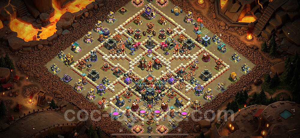 This Town Hall 17 war base is specifically designed to defend against 2-star and 3-star attacks in Clan Wars and Clan War Leagues. The strategic placement of defenses creates multiple compartments that force attackers to use more troops and spells than anticipated. Key defensive structures like Eagle Artillery, Inferno Towers, and X-Bows are positioned to cover crucial sections of the base, making it extremely difficult for opponents to secure a perfect attack. The core of this war base features a centralized Town Hall and Clan Castle, protected by multiple layers of walls and high-damage defenses. This layout forces attackers to commit significant resources just to reach the center, often leaving them without enough firepower to secure the Town Hall destruction. The anti-2-star design ensures that even if attackers breach the outer defenses, they'll struggle to achieve a 50% destruction rating. Air defenses are strategically spread to counter popular air attack strategies like LaLoon (Lava Hound + Balloons) and Electrone (Electro Dragons + Stone Slammer). The symmetrical trap placement and strategic Hidden Tesla positions create deadly surprise elements that can completely derail an attacker's plan. This base has been tested against various meta attack strategies and has consistently proven effective in preventing 3-star attacks.