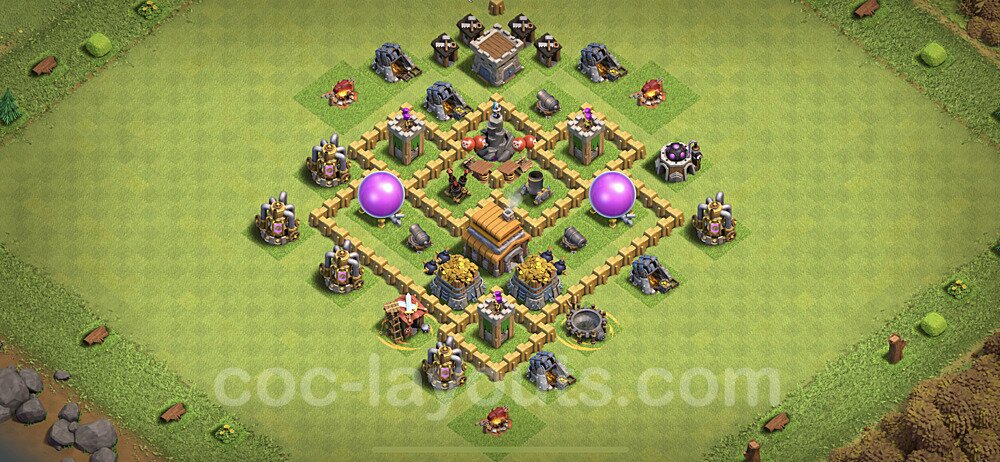 This Town Hall 5 hybrid base offers the best of both worlds - strong resource protection combined with effective trophy defense. The versatile design makes it an excellent choice for players who want to protect their loot while maintaining their trophy count. This balanced approach ensures you don't sacrifice one aspect of defense for another, making it ideal for active players across all league levels. The hybrid layout features centralized resource storages alongside a well-protected Town Hall, with multiple defensive layers that deter both farming raids and trophy pushers. High-value targets are strategically positioned within overlapping defense ranges, forcing attackers to make difficult choices about which objectives to prioritize. The compartmentalized design prevents attackers from easily achieving both loot destruction and the Town Hall kill in a single attack. Defense placement in this hybrid base creates strong coverage against both ground and air attacks. Inferno Towers, X-Bows, and Eagle Artillery work in concert to eliminate threats quickly, while splash damage defenses like Wizard Towers and Bomb Towers counter swarm strategies. The base's funnel-resistant design and strategic trap placement make it effective against popular attack strategies including QC LaLoon (Queen Charge Lava Hound Balloon), Blizzard attacks, and Yeti Smash compositions.