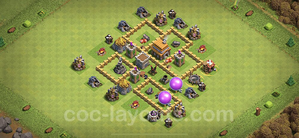 This Town Hall 5 war base is specifically designed to defend against 2-star and 3-star attacks in Clan Wars and Clan War Leagues. The strategic placement of defenses creates multiple compartments that force attackers to use more troops and spells than anticipated. Key defensive structures like Eagle Artillery, Inferno Towers, and X-Bows are positioned to cover crucial sections of the base, making it extremely difficult for opponents to secure a perfect attack. The core of this war base features a centralized Town Hall and Clan Castle, protected by multiple layers of walls and high-damage defenses. This layout forces attackers to commit significant resources just to reach the center, often leaving them without enough firepower to secure the Town Hall destruction. The anti-2-star design ensures that even if attackers breach the outer defenses, they'll struggle to achieve a 50% destruction rating. Air defenses are strategically spread to counter popular air attack strategies like LaLoon (Lava Hound + Balloons) and Electrone (Electro Dragons + Stone Slammer). The symmetrical trap placement and strategic Hidden Tesla positions create deadly surprise elements that can completely derail an attacker's plan. This base has been tested against various meta attack strategies and has consistently proven effective in preventing 3-star attacks.