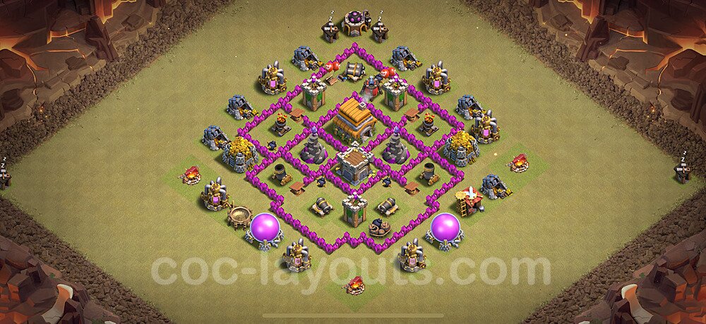 This Town Hall 6 war base is specifically designed to defend against 2-star and 3-star attacks in Clan Wars and Clan War Leagues. The strategic placement of defenses creates multiple compartments that force attackers to use more troops and spells than anticipated. Key defensive structures like Eagle Artillery, Inferno Towers, and X-Bows are positioned to cover crucial sections of the base, making it extremely difficult for opponents to secure a perfect attack. The core of this war base features a centralized Town Hall and Clan Castle, protected by multiple layers of walls and high-damage defenses. This layout forces attackers to commit significant resources just to reach the center, often leaving them without enough firepower to secure the Town Hall destruction. The anti-2-star design ensures that even if attackers breach the outer defenses, they'll struggle to achieve a 50% destruction rating. Air defenses are strategically spread to counter popular air attack strategies like LaLoon (Lava Hound + Balloons) and Electrone (Electro Dragons + Stone Slammer). The symmetrical trap placement and strategic Hidden Tesla positions create deadly surprise elements that can completely derail an attacker's plan. This base has been tested against various meta attack strategies and has consistently proven effective in preventing 3-star attacks.