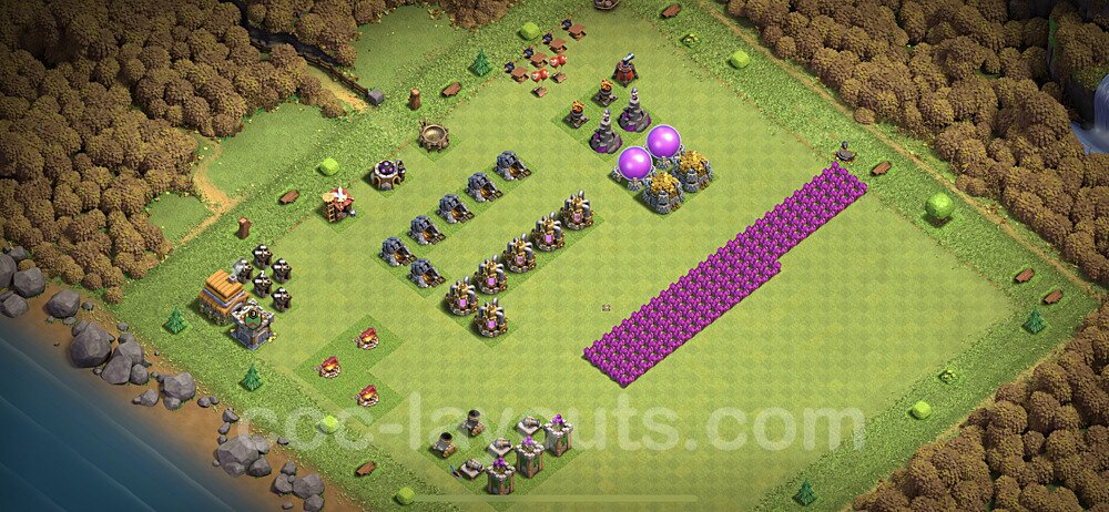 This Town Hall 6 war base is specifically designed to defend against 2-star and 3-star attacks in Clan Wars and Clan War Leagues. The strategic placement of defenses creates multiple compartments that force attackers to use more troops and spells than anticipated. Key defensive structures like Eagle Artillery, Inferno Towers, and X-Bows are positioned to cover crucial sections of the base, making it extremely difficult for opponents to secure a perfect attack. The core of this war base features a centralized Town Hall and Clan Castle, protected by multiple layers of walls and high-damage defenses. This layout forces attackers to commit significant resources just to reach the center, often leaving them without enough firepower to secure the Town Hall destruction. The anti-2-star design ensures that even if attackers breach the outer defenses, they'll struggle to achieve a 50% destruction rating. Air defenses are strategically spread to counter popular air attack strategies like LaLoon (Lava Hound + Balloons) and Electrone (Electro Dragons + Stone Slammer). The symmetrical trap placement and strategic Hidden Tesla positions create deadly surprise elements that can completely derail an attacker's plan. This base has been tested against various meta attack strategies and has consistently proven effective in preventing 3-star attacks.
