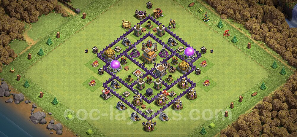 This Town Hall 7 hybrid base offers the best of both worlds - strong resource protection combined with effective trophy defense. The versatile design makes it an excellent choice for players who want to protect their loot while maintaining their trophy count. This balanced approach ensures you don't sacrifice one aspect of defense for another, making it ideal for active players across all league levels. The hybrid layout features centralized resource storages alongside a well-protected Town Hall, with multiple defensive layers that deter both farming raids and trophy pushers. High-value targets are strategically positioned within overlapping defense ranges, forcing attackers to make difficult choices about which objectives to prioritize. The compartmentalized design prevents attackers from easily achieving both loot destruction and the Town Hall kill in a single attack. Defense placement in this hybrid base creates strong coverage against both ground and air attacks. Inferno Towers, X-Bows, and Eagle Artillery work in concert to eliminate threats quickly, while splash damage defenses like Wizard Towers and Bomb Towers counter swarm strategies. The base's funnel-resistant design and strategic trap placement make it effective against popular attack strategies including QC LaLoon (Queen Charge Lava Hound Balloon), Blizzard attacks, and Yeti Smash compositions.