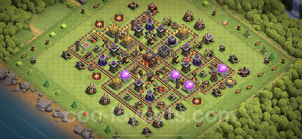 This Town Hall 10 hybrid base offers the best of both worlds - strong resource protection combined with effective trophy defense. The versatile design makes it an excellent choice for players who want to protect their loot while maintaining their trophy count. This balanced approach ensures you don't sacrifice one aspect of defense for another, making it ideal for active players across all league levels. The hybrid layout features centralized resource storages alongside a well-protected Town Hall, with multiple defensive layers that deter both farming raids and trophy pushers. High-value targets are strategically positioned within overlapping defense ranges, forcing attackers to make difficult choices about which objectives to prioritize. The compartmentalized design prevents attackers from easily achieving both loot destruction and the Town Hall kill in a single attack. Defense placement in this hybrid base creates strong coverage against both ground and air attacks. Inferno Towers, X-Bows, and Eagle Artillery work in concert to eliminate threats quickly, while splash damage defenses like Wizard Towers and Bomb Towers counter swarm strategies. The base's funnel-resistant design and strategic trap placement make it effective against popular attack strategies including QC LaLoon (Queen Charge Lava Hound Balloon), Blizzard attacks, and Yeti Smash compositions.