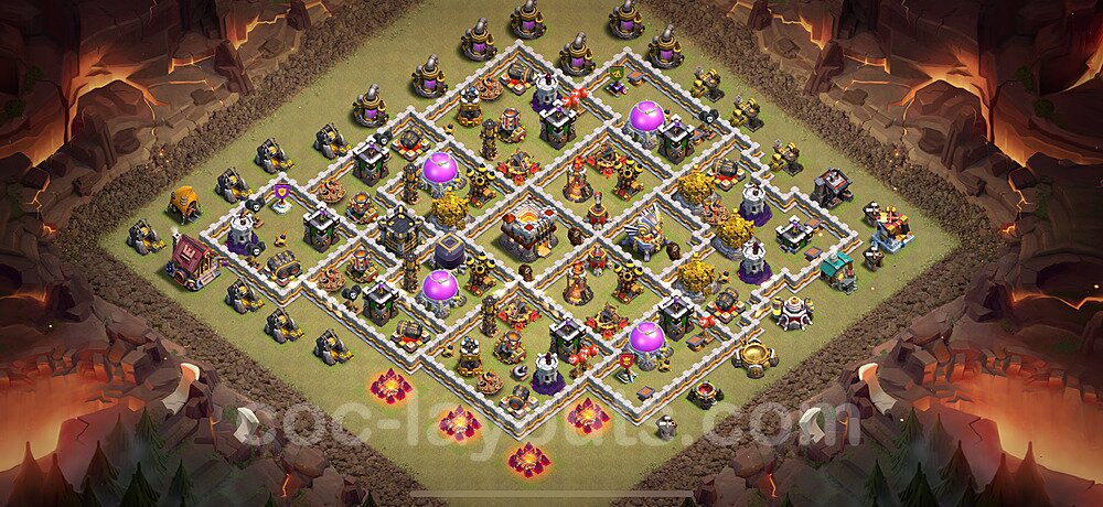 This Town Hall 11 hybrid base offers the best of both worlds - strong resource protection combined with effective trophy defense. The versatile design makes it an excellent choice for players who want to protect their loot while maintaining their trophy count. This balanced approach ensures you don't sacrifice one aspect of defense for another, making it ideal for active players across all league levels. The hybrid layout features centralized resource storages alongside a well-protected Town Hall, with multiple defensive layers that deter both farming raids and trophy pushers. High-value targets are strategically positioned within overlapping defense ranges, forcing attackers to make difficult choices about which objectives to prioritize. The compartmentalized design prevents attackers from easily achieving both loot destruction and the Town Hall kill in a single attack. Defense placement in this hybrid base creates strong coverage against both ground and air attacks. Inferno Towers, X-Bows, and Eagle Artillery work in concert to eliminate threats quickly, while splash damage defenses like Wizard Towers and Bomb Towers counter swarm strategies. The base's funnel-resistant design and strategic trap placement make it effective against popular attack strategies including QC LaLoon (Queen Charge Lava Hound Balloon), Blizzard attacks, and Yeti Smash compositions.