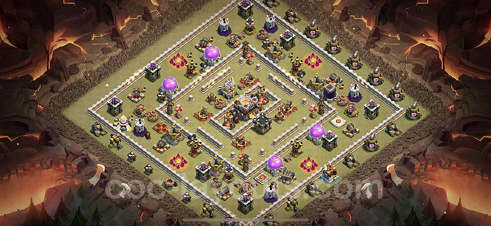 This Town Hall 11 hybrid base offers the best of both worlds - strong resource protection combined with effective trophy defense. The versatile design makes it an excellent choice for players who want to protect their loot while maintaining their trophy count. This balanced approach ensures you don't sacrifice one aspect of defense for another, making it ideal for active players across all league levels. The hybrid layout features centralized resource storages alongside a well-protected Town Hall, with multiple defensive layers that deter both farming raids and trophy pushers. High-value targets are strategically positioned within overlapping defense ranges, forcing attackers to make difficult choices about which objectives to prioritize. The compartmentalized design prevents attackers from easily achieving both loot destruction and the Town Hall kill in a single attack. Defense placement in this hybrid base creates strong coverage against both ground and air attacks. Inferno Towers, X-Bows, and Eagle Artillery work in concert to eliminate threats quickly, while splash damage defenses like Wizard Towers and Bomb Towers counter swarm strategies. The base's funnel-resistant design and strategic trap placement make it effective against popular attack strategies including QC LaLoon (Queen Charge Lava Hound Balloon), Blizzard attacks, and Yeti Smash compositions.