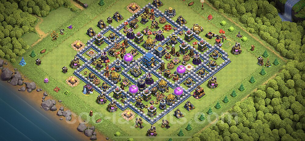 This Town Hall 12 hybrid base offers the best of both worlds - strong resource protection combined with effective trophy defense. The versatile design makes it an excellent choice for players who want to protect their loot while maintaining their trophy count. This balanced approach ensures you don't sacrifice one aspect of defense for another, making it ideal for active players across all league levels. The hybrid layout features centralized resource storages alongside a well-protected Town Hall, with multiple defensive layers that deter both farming raids and trophy pushers. High-value targets are strategically positioned within overlapping defense ranges, forcing attackers to make difficult choices about which objectives to prioritize. The compartmentalized design prevents attackers from easily achieving both loot destruction and the Town Hall kill in a single attack. Defense placement in this hybrid base creates strong coverage against both ground and air attacks. Inferno Towers, X-Bows, and Eagle Artillery work in concert to eliminate threats quickly, while splash damage defenses like Wizard Towers and Bomb Towers counter swarm strategies. The base's funnel-resistant design and strategic trap placement make it effective against popular attack strategies including QC LaLoon (Queen Charge Lava Hound Balloon), Blizzard attacks, and Yeti Smash compositions.