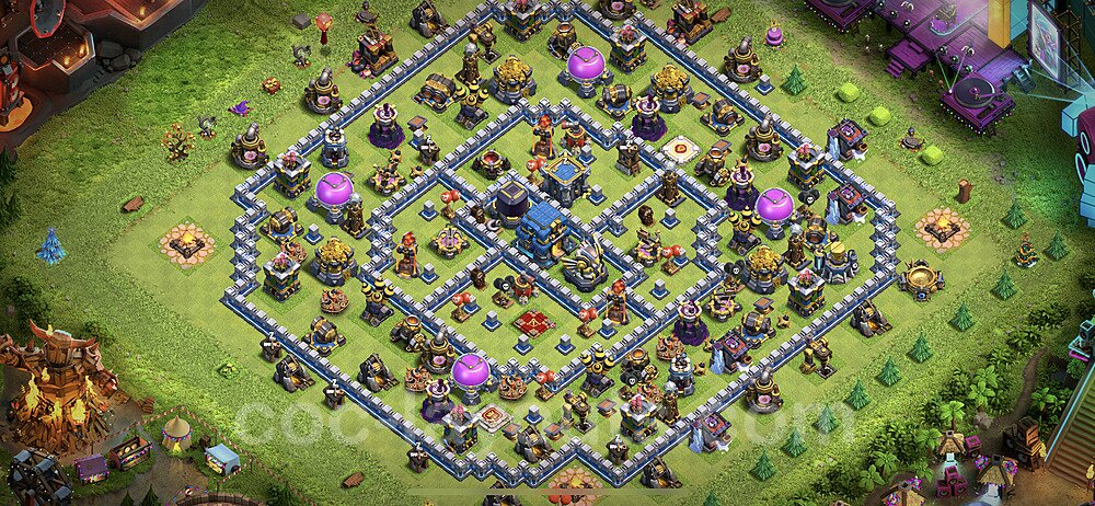 This Town Hall 12 hybrid base offers the best of both worlds - strong resource protection combined with effective trophy defense. The versatile design makes it an excellent choice for players who want to protect their loot while maintaining their trophy count. This balanced approach ensures you don't sacrifice one aspect of defense for another, making it ideal for active players across all league levels. The hybrid layout features centralized resource storages alongside a well-protected Town Hall, with multiple defensive layers that deter both farming raids and trophy pushers. High-value targets are strategically positioned within overlapping defense ranges, forcing attackers to make difficult choices about which objectives to prioritize. The compartmentalized design prevents attackers from easily achieving both loot destruction and the Town Hall kill in a single attack. Defense placement in this hybrid base creates strong coverage against both ground and air attacks. Inferno Towers, X-Bows, and Eagle Artillery work in concert to eliminate threats quickly, while splash damage defenses like Wizard Towers and Bomb Towers counter swarm strategies. The base's funnel-resistant design and strategic trap placement make it effective against popular attack strategies including QC LaLoon (Queen Charge Lava Hound Balloon), Blizzard attacks, and Yeti Smash compositions.