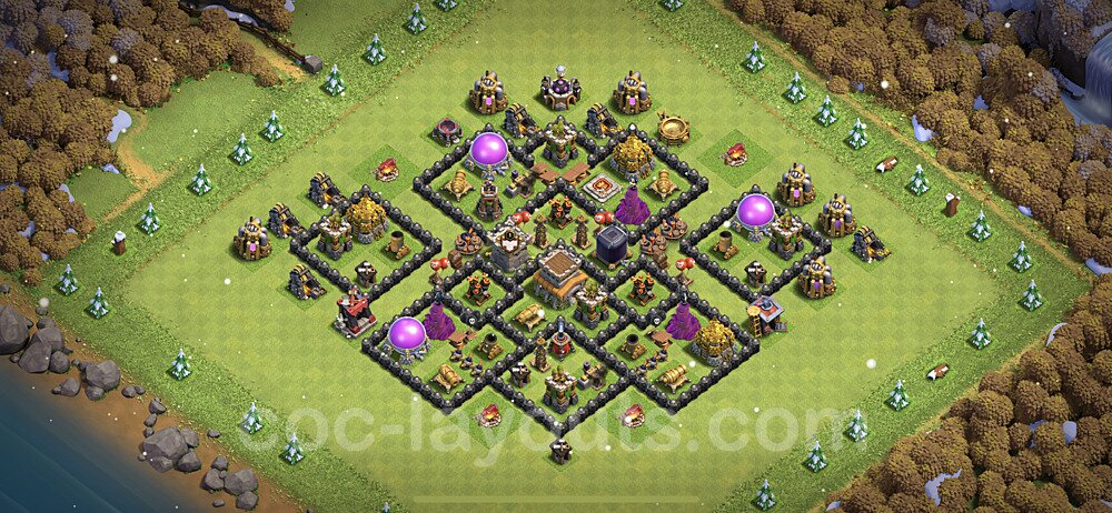 This Town Hall 8 hybrid base offers the best of both worlds - strong resource protection combined with effective trophy defense. The versatile design makes it an excellent choice for players who want to protect their loot while maintaining their trophy count. This balanced approach ensures you don't sacrifice one aspect of defense for another, making it ideal for active players across all league levels. The hybrid layout features centralized resource storages alongside a well-protected Town Hall, with multiple defensive layers that deter both farming raids and trophy pushers. High-value targets are strategically positioned within overlapping defense ranges, forcing attackers to make difficult choices about which objectives to prioritize. The compartmentalized design prevents attackers from easily achieving both loot destruction and the Town Hall kill in a single attack. Defense placement in this hybrid base creates strong coverage against both ground and air attacks. Inferno Towers, X-Bows, and Eagle Artillery work in concert to eliminate threats quickly, while splash damage defenses like Wizard Towers and Bomb Towers counter swarm strategies. The base's funnel-resistant design and strategic trap placement make it effective against popular attack strategies including QC LaLoon (Queen Charge Lava Hound Balloon), Blizzard attacks, and Yeti Smash compositions.