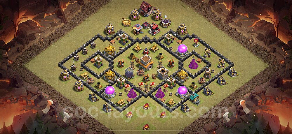 This Town Hall 8 hybrid base offers the best of both worlds - strong resource protection combined with effective trophy defense. The versatile design makes it an excellent choice for players who want to protect their loot while maintaining their trophy count. This balanced approach ensures you don't sacrifice one aspect of defense for another, making it ideal for active players across all league levels. The hybrid layout features centralized resource storages alongside a well-protected Town Hall, with multiple defensive layers that deter both farming raids and trophy pushers. High-value targets are strategically positioned within overlapping defense ranges, forcing attackers to make difficult choices about which objectives to prioritize. The compartmentalized design prevents attackers from easily achieving both loot destruction and the Town Hall kill in a single attack. Defense placement in this hybrid base creates strong coverage against both ground and air attacks. Inferno Towers, X-Bows, and Eagle Artillery work in concert to eliminate threats quickly, while splash damage defenses like Wizard Towers and Bomb Towers counter swarm strategies. The base's funnel-resistant design and strategic trap placement make it effective against popular attack strategies including QC LaLoon (Queen Charge Lava Hound Balloon), Blizzard attacks, and Yeti Smash compositions.