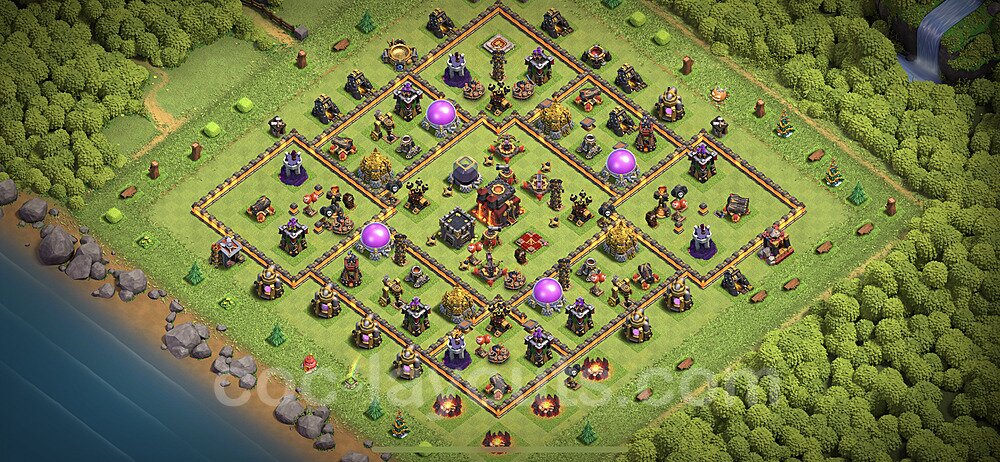This Town Hall 10 hybrid base offers the best of both worlds - strong resource protection combined with effective trophy defense. The versatile design makes it an excellent choice for players who want to protect their loot while maintaining their trophy count. This balanced approach ensures you don't sacrifice one aspect of defense for another, making it ideal for active players across all league levels. The hybrid layout features centralized resource storages alongside a well-protected Town Hall, with multiple defensive layers that deter both farming raids and trophy pushers. High-value targets are strategically positioned within overlapping defense ranges, forcing attackers to make difficult choices about which objectives to prioritize. The compartmentalized design prevents attackers from easily achieving both loot destruction and the Town Hall kill in a single attack. Defense placement in this hybrid base creates strong coverage against both ground and air attacks. Inferno Towers, X-Bows, and Eagle Artillery work in concert to eliminate threats quickly, while splash damage defenses like Wizard Towers and Bomb Towers counter swarm strategies. The base's funnel-resistant design and strategic trap placement make it effective against popular attack strategies including QC LaLoon (Queen Charge Lava Hound Balloon), Blizzard attacks, and Yeti Smash compositions.