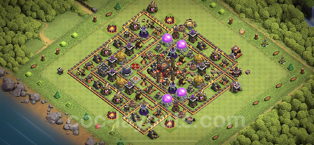 This Town Hall 10 hybrid base offers the best of both worlds - strong resource protection combined with effective trophy defense. The versatile design makes it an excellent choice for players who want to protect their loot while maintaining their trophy count. This balanced approach ensures you don't sacrifice one aspect of defense for another, making it ideal for active players across all league levels. The hybrid layout features centralized resource storages alongside a well-protected Town Hall, with multiple defensive layers that deter both farming raids and trophy pushers. High-value targets are strategically positioned within overlapping defense ranges, forcing attackers to make difficult choices about which objectives to prioritize. The compartmentalized design prevents attackers from easily achieving both loot destruction and the Town Hall kill in a single attack. Defense placement in this hybrid base creates strong coverage against both ground and air attacks. Inferno Towers, X-Bows, and Eagle Artillery work in concert to eliminate threats quickly, while splash damage defenses like Wizard Towers and Bomb Towers counter swarm strategies. The base's funnel-resistant design and strategic trap placement make it effective against popular attack strategies including QC LaLoon (Queen Charge Lava Hound Balloon), Blizzard attacks, and Yeti Smash compositions.