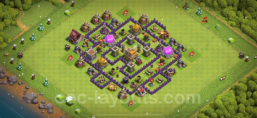 This Town Hall 7 hybrid base offers the best of both worlds - strong resource protection combined with effective trophy defense. The versatile design makes it an excellent choice for players who want to protect their loot while maintaining their trophy count. This balanced approach ensures you don't sacrifice one aspect of defense for another, making it ideal for active players across all league levels. The hybrid layout features centralized resource storages alongside a well-protected Town Hall, with multiple defensive layers that deter both farming raids and trophy pushers. High-value targets are strategically positioned within overlapping defense ranges, forcing attackers to make difficult choices about which objectives to prioritize. The compartmentalized design prevents attackers from easily achieving both loot destruction and the Town Hall kill in a single attack. Defense placement in this hybrid base creates strong coverage against both ground and air attacks. Inferno Towers, X-Bows, and Eagle Artillery work in concert to eliminate threats quickly, while splash damage defenses like Wizard Towers and Bomb Towers counter swarm strategies. The base's funnel-resistant design and strategic trap placement make it effective against popular attack strategies including QC LaLoon (Queen Charge Lava Hound Balloon), Blizzard attacks, and Yeti Smash compositions.