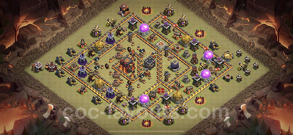 This Town Hall 10 hybrid base offers the best of both worlds - strong resource protection combined with effective trophy defense. The versatile design makes it an excellent choice for players who want to protect their loot while maintaining their trophy count. This balanced approach ensures you don't sacrifice one aspect of defense for another, making it ideal for active players across all league levels. The hybrid layout features centralized resource storages alongside a well-protected Town Hall, with multiple defensive layers that deter both farming raids and trophy pushers. High-value targets are strategically positioned within overlapping defense ranges, forcing attackers to make difficult choices about which objectives to prioritize. The compartmentalized design prevents attackers from easily achieving both loot destruction and the Town Hall kill in a single attack. Defense placement in this hybrid base creates strong coverage against both ground and air attacks. Inferno Towers, X-Bows, and Eagle Artillery work in concert to eliminate threats quickly, while splash damage defenses like Wizard Towers and Bomb Towers counter swarm strategies. The base's funnel-resistant design and strategic trap placement make it effective against popular attack strategies including QC LaLoon (Queen Charge Lava Hound Balloon), Blizzard attacks, and Yeti Smash compositions.