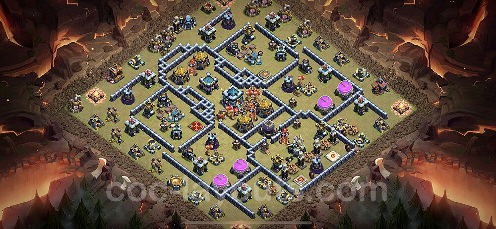 This Town Hall 13 hybrid base offers the best of both worlds - strong resource protection combined with effective trophy defense. The versatile design makes it an excellent choice for players who want to protect their loot while maintaining their trophy count. This balanced approach ensures you don't sacrifice one aspect of defense for another, making it ideal for active players across all league levels. The hybrid layout features centralized resource storages alongside a well-protected Town Hall, with multiple defensive layers that deter both farming raids and trophy pushers. High-value targets are strategically positioned within overlapping defense ranges, forcing attackers to make difficult choices about which objectives to prioritize. The compartmentalized design prevents attackers from easily achieving both loot destruction and the Town Hall kill in a single attack. Defense placement in this hybrid base creates strong coverage against both ground and air attacks. Inferno Towers, X-Bows, and Eagle Artillery work in concert to eliminate threats quickly, while splash damage defenses like Wizard Towers and Bomb Towers counter swarm strategies. The base's funnel-resistant design and strategic trap placement make it effective against popular attack strategies including QC LaLoon (Queen Charge Lava Hound Balloon), Blizzard attacks, and Yeti Smash compositions.