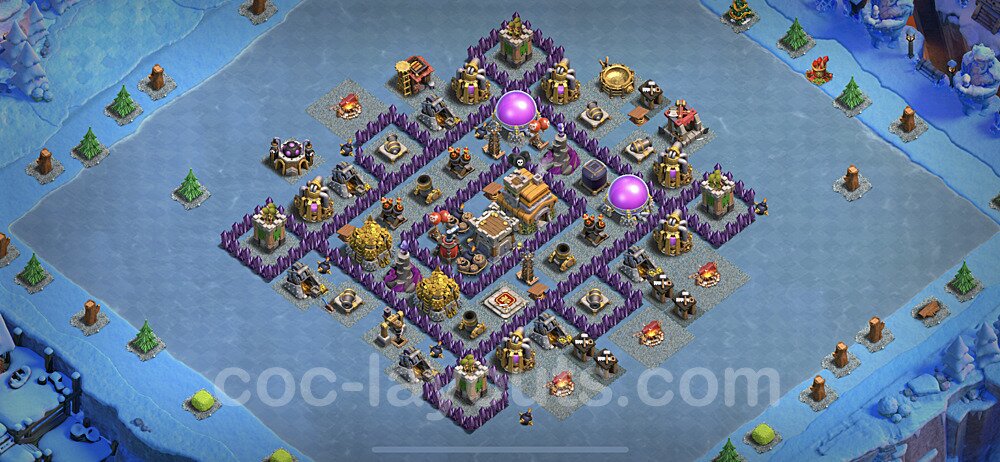 This Town Hall 7 hybrid base offers the best of both worlds - strong resource protection combined with effective trophy defense. The versatile design makes it an excellent choice for players who want to protect their loot while maintaining their trophy count. This balanced approach ensures you don't sacrifice one aspect of defense for another, making it ideal for active players across all league levels. The hybrid layout features centralized resource storages alongside a well-protected Town Hall, with multiple defensive layers that deter both farming raids and trophy pushers. High-value targets are strategically positioned within overlapping defense ranges, forcing attackers to make difficult choices about which objectives to prioritize. The compartmentalized design prevents attackers from easily achieving both loot destruction and the Town Hall kill in a single attack. Defense placement in this hybrid base creates strong coverage against both ground and air attacks. Inferno Towers, X-Bows, and Eagle Artillery work in concert to eliminate threats quickly, while splash damage defenses like Wizard Towers and Bomb Towers counter swarm strategies. The base's funnel-resistant design and strategic trap placement make it effective against popular attack strategies including QC LaLoon (Queen Charge Lava Hound Balloon), Blizzard attacks, and Yeti Smash compositions.