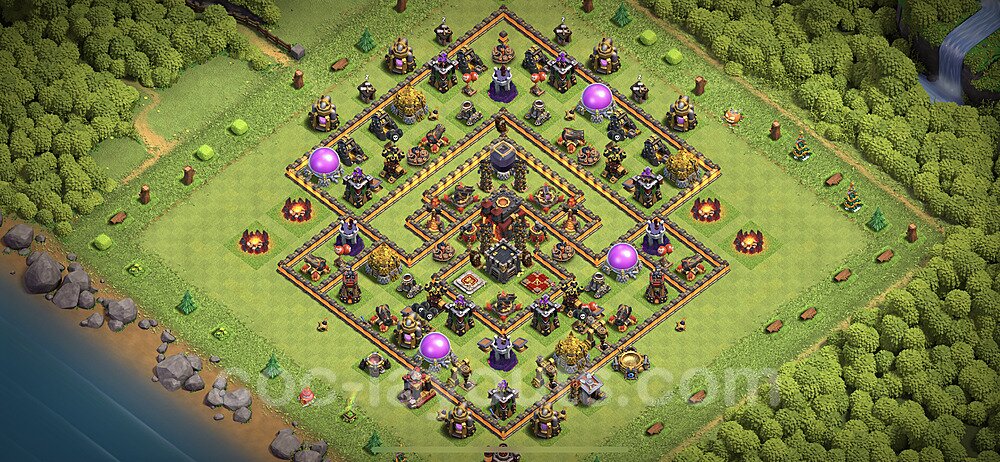 This Town Hall 10 hybrid base offers the best of both worlds - strong resource protection combined with effective trophy defense. The versatile design makes it an excellent choice for players who want to protect their loot while maintaining their trophy count. This balanced approach ensures you don't sacrifice one aspect of defense for another, making it ideal for active players across all league levels. The hybrid layout features centralized resource storages alongside a well-protected Town Hall, with multiple defensive layers that deter both farming raids and trophy pushers. High-value targets are strategically positioned within overlapping defense ranges, forcing attackers to make difficult choices about which objectives to prioritize. The compartmentalized design prevents attackers from easily achieving both loot destruction and the Town Hall kill in a single attack. Defense placement in this hybrid base creates strong coverage against both ground and air attacks. Inferno Towers, X-Bows, and Eagle Artillery work in concert to eliminate threats quickly, while splash damage defenses like Wizard Towers and Bomb Towers counter swarm strategies. The base's funnel-resistant design and strategic trap placement make it effective against popular attack strategies including QC LaLoon (Queen Charge Lava Hound Balloon), Blizzard attacks, and Yeti Smash compositions.