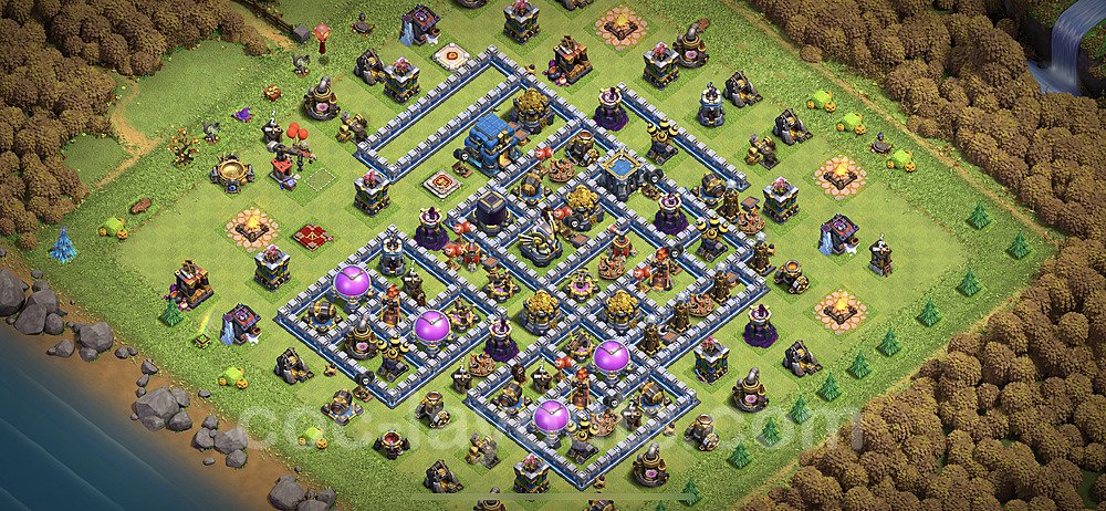 This Town Hall 12 hybrid base offers the best of both worlds - strong resource protection combined with effective trophy defense. The versatile design makes it an excellent choice for players who want to protect their loot while maintaining their trophy count. This balanced approach ensures you don't sacrifice one aspect of defense for another, making it ideal for active players across all league levels. The hybrid layout features centralized resource storages alongside a well-protected Town Hall, with multiple defensive layers that deter both farming raids and trophy pushers. High-value targets are strategically positioned within overlapping defense ranges, forcing attackers to make difficult choices about which objectives to prioritize. The compartmentalized design prevents attackers from easily achieving both loot destruction and the Town Hall kill in a single attack. Defense placement in this hybrid base creates strong coverage against both ground and air attacks. Inferno Towers, X-Bows, and Eagle Artillery work in concert to eliminate threats quickly, while splash damage defenses like Wizard Towers and Bomb Towers counter swarm strategies. The base's funnel-resistant design and strategic trap placement make it effective against popular attack strategies including QC LaLoon (Queen Charge Lava Hound Balloon), Blizzard attacks, and Yeti Smash compositions.